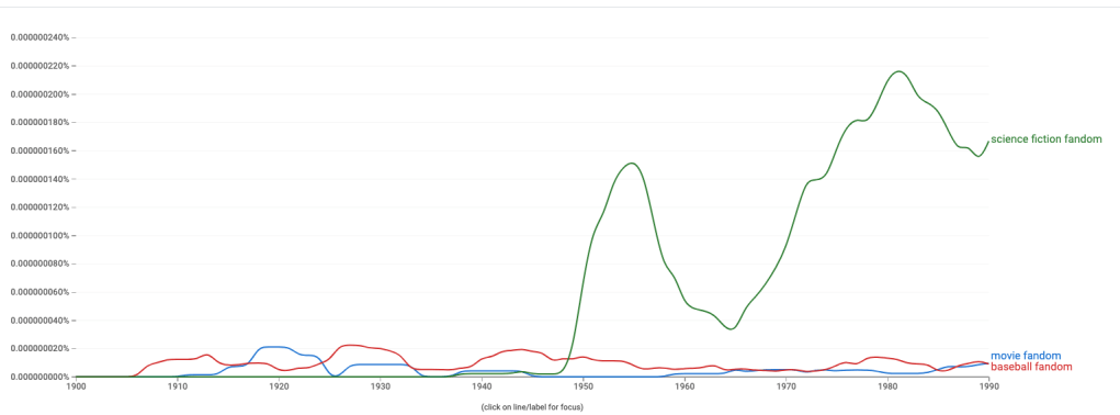 Google Ngrams, “movie fandom,baseball fandom,science fiction fandom; 1900-1990.” Accessed March 12, 2021. https://books.google.com/ngrams/graph?content=movie+fandom%2Cbaseball+fandom%2Cscience+fiction+fandom&year_start=1900&year_end=1990&corpus=26&smoothing=3&direct_url=t1%3B%2Cmovie%20fandom%3B%2Cc0%3B.t1%3B%2Cbaseball%20fandom%3B%2Cc0%3B.t1%3B%2Cscience%20fiction%20fandom%3B%2Cc0.