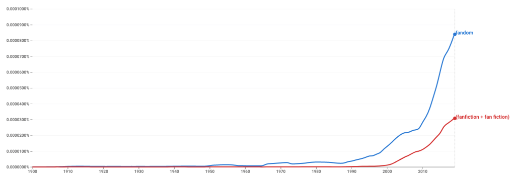 Google Ngrams, “fandom,(fanfiction + fan fiction); 1900-2019.” Accessed March 12, 2021. https://books.google.com/ngrams/graph?content=fandom%2C%28fanfiction+%2B+fan+fiction%29&year_start=1900&year_end=2019&corpus=26&smoothing=3&direct_url=t1%3B%2Cfandom%3B%2Cc0%3B.t1%3B%2C%28fanfiction%20%2B%20fan%20fiction%29%3B%2Cc0#t1%3B%2Cfandom%3B%2Cc1%3B.t1%3B%2C(fanfiction%20%2B%20fan%20fiction)%3B%2Cc0.